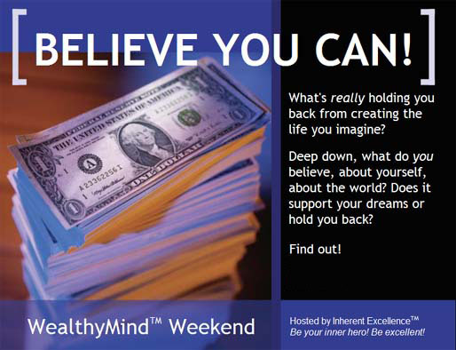 financial freedom! WEALTH STARTS IN THE MIND! Space is limited. Pick up the phone and call now to reserve your seat. Dates:Dates to be announced. Please contact us immediately for more details! Inherent Excellence 2-Day IntensiveWhat if, in 2 days, you learned how to use the tools you already have, make them work better, get new tools, and find out what's limiting you? How about leaving with deep clarity of your destiny? This intensive is about YOU! Your dreams and your change. This isn't one of those motivation seminars. This is a deep workshop for people that want real lasting change. You'll learn where limiting beliefs come from and we'll do exercises for real lasting change. We won't just talk about excellence, you'll "get it in the muscle" and walk, or fly, away with a different perspective on your dreams and what's holding you back. Learn how to tap into your Inherent Excellence and naturally create a new experience of life and goals. Day 1 - Know Thyself - What it's like to be Human